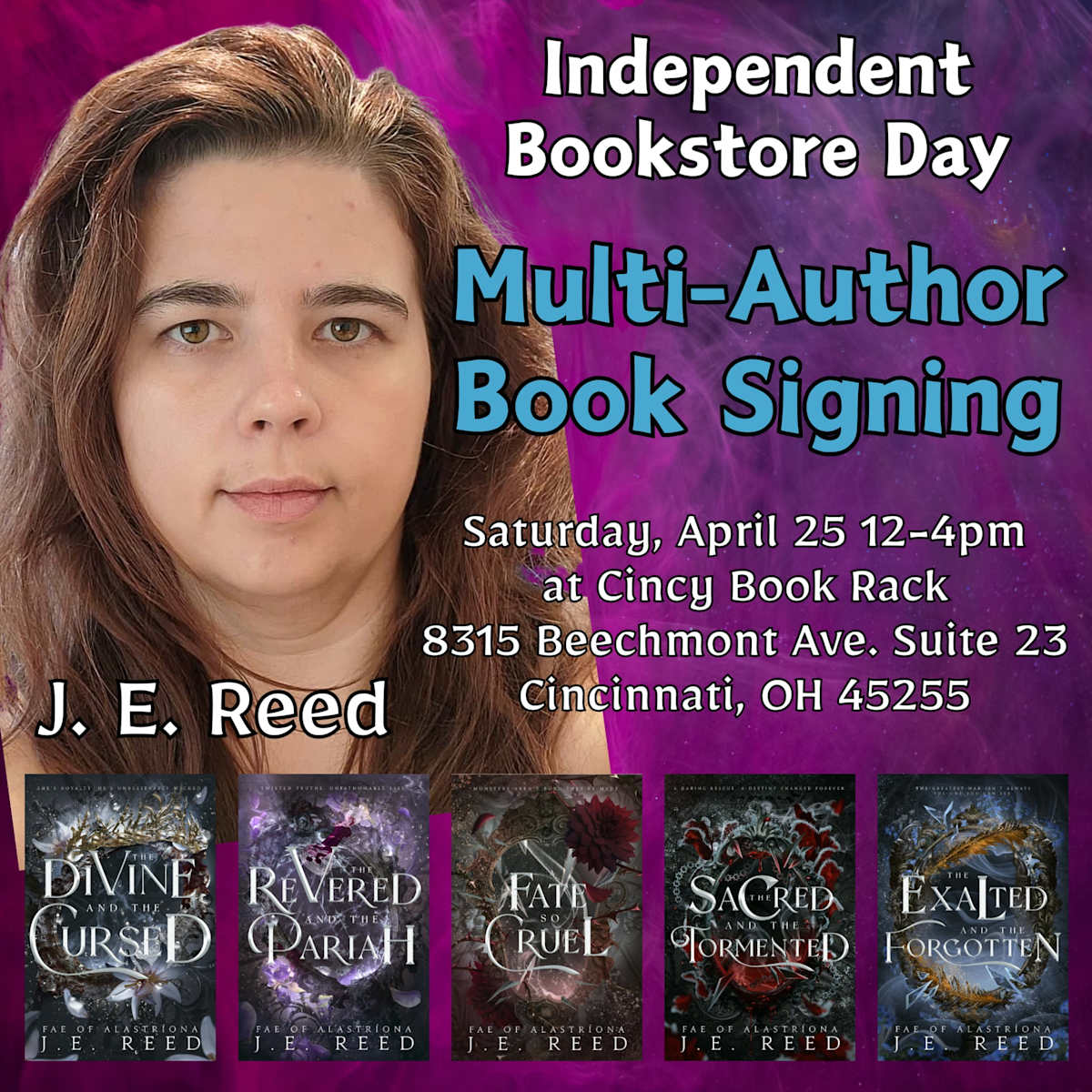 J. E. Reed will be signing her bestselling Fae of Alastríona romantasy series at Cincy Book Rack on Saturday, April 25 from 12 to 4pm! This is her first event in nearly 4 years! Be sure to stop in and say hello!